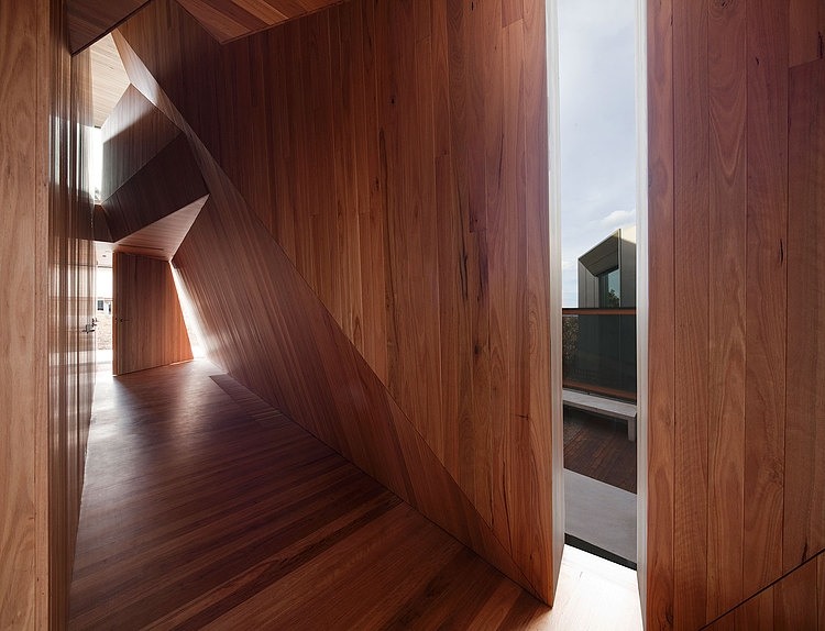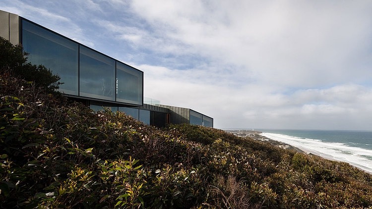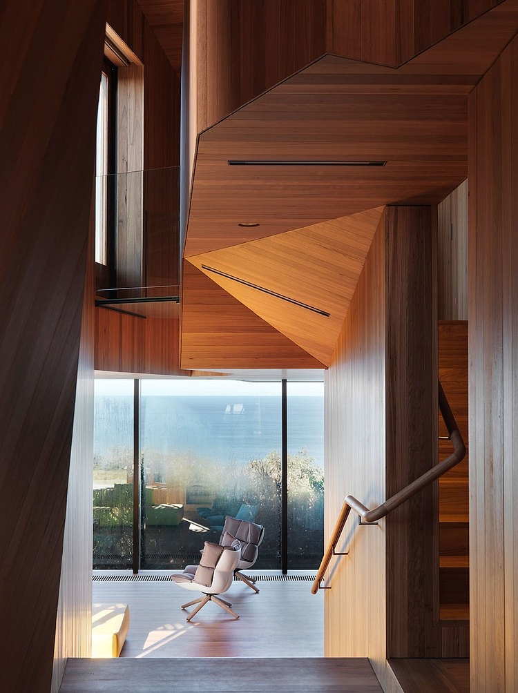 The spatial journey through the house from arrival to view is choreographed to increase anticipation before reaching the main living space. As you step beneath a cantilevered study into a dramatic vertical entry space, you become acutely aware of a number of twists and folds along its length that make the transformation into horizontal living space. The main window aperture matches the cinematic proportions of the ocean view.