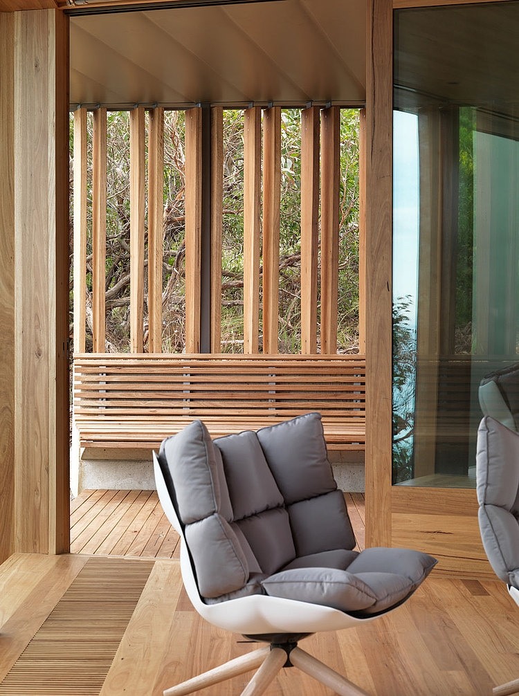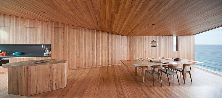 Materially the house is clad in a green-grey zinc cladding, for both its longevity and natural colouring that merges with the scrub and tea tree landscape. In contrast, the interior of the house is completely lined in timber (floors, walls, cabinetry and ceilings) to form an enclosure for living that its inhabitants become completely immersed within. The eye is then always drawn back to the outlook beyond.